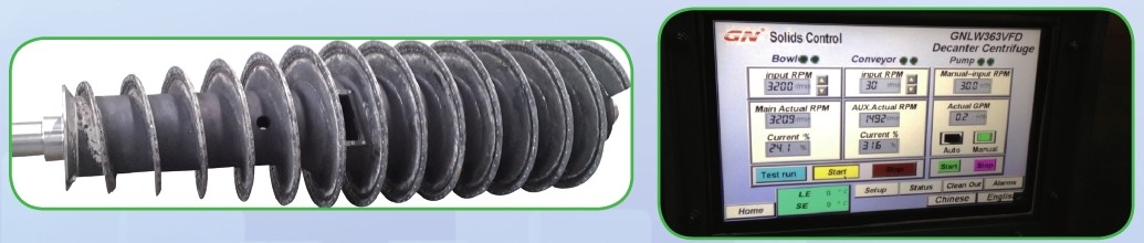 GNLW系列泥漿離心機( Decanter Centrifuge) 又稱臥式螺旋卸料沉降離心機、泥漿離心機,是針對石油鉆井液的特點,設計的固液分離專用設備,可在全速運轉下完成進料、離心沉降、卸料等各道工序,主要用于回收重晶石,清除細小固體,降低鉆井液的固體含量,控制鉆井液的密度、粘度,保證鉆井液的性能以及對快速鉆井均有重要作用。GNLW系列離心機是利用離心沉降原理對鉆井懸浮液進行分離,懸浮液由進料管經螺旋推料器中出液孔進入轉鼓,在離心力 的作用下固相顆粒被推向轉鼓內壁,通過螺旋推料器上的葉片推至轉鼓小端排渣口排出,液相則通過轉鼓大端的溢流孔溢出。如此不斷循環,以達到連續分離的目的。沉降型離心機屬于臥式螺旋離心機范疇,全稱臥式螺旋沉降型離心機。冠能固控生產的臥式沉降型泥漿離心機廣泛應用于石油鉆井行業。