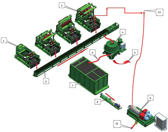 鉆井泥漿不落地處理工作流程說明如下:鉆機(jī)過來的泥漿通過高架管匯進(jìn)入振動篩(1)、清潔器(2),經(jīng)過(1)、(2) 處理排放的鉆屑通過螺旋輸送器(3)輸送至立式甩干機(jī)處理(4)。立式甩干機(jī)處理完的固體通過廢渣(5) 排除,回收到的鉆井泥漿(6)進(jìn)入鉆井液泥漿罐體(7),離心機(jī)供液泵或螺桿泵(8)抽取含有細(xì)固 顆粒的回收泥漿,供給離心機(jī)(9 )處理,固體部分通過固體排渣口(10)排除,處理完成的鉆井液通 過干凈泥漿回歸泥漿系統(tǒng)(11)。