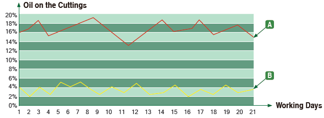 B: 冠能鉆屑甩干機(jī)處理后的鉆屑含油量。